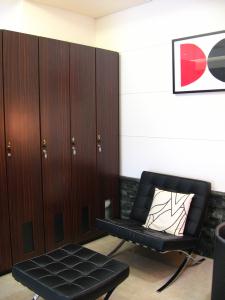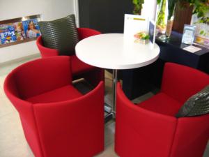 白を基調にした空間の中に、赤と黒のイスがポイント
