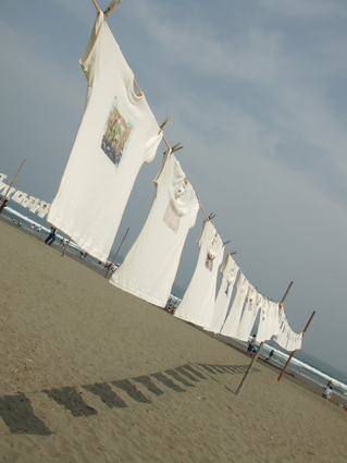 砂浜を美術館に見立てて、2~3000枚のTシャツがアートされてます!