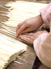切れたそうめんは、短いものや太すぎるもの、曲がっているもの等があるので、それを1つひとつ手作業で省いていきます。