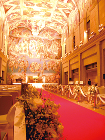 挙式会場は、ヴァティカンの「システィーナ礼拝堂」天井画と正面祭壇壁画を原寸大に立体再現した「システィーナ・ホール」