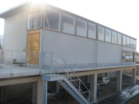真っ白な建物。建物の上の方はガラス張りになっていてたくさんの光が差し込み、よりキレイな写真が撮影できるスタジオになっています。