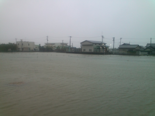 ・ 出るに出れず、その日は会社をお休みさせていただきました。裏の田んぼ&川は、一体化してしまって