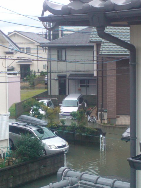 家の前の冠水は、一晩中かかって、ようやく翌朝には水がひいていて、普通の暮らしがもどりました。団地の出入り口にむかって、けっこうナナメになってるんだな~と地形をあらためて感じました。